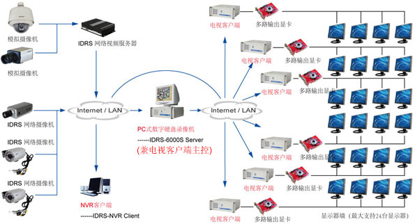 3)以IDRS-NVMS網(wǎng)絡視頻集中管理系統(tǒng)作為主控設備的網(wǎng)絡電視墻典型應用原理圖: