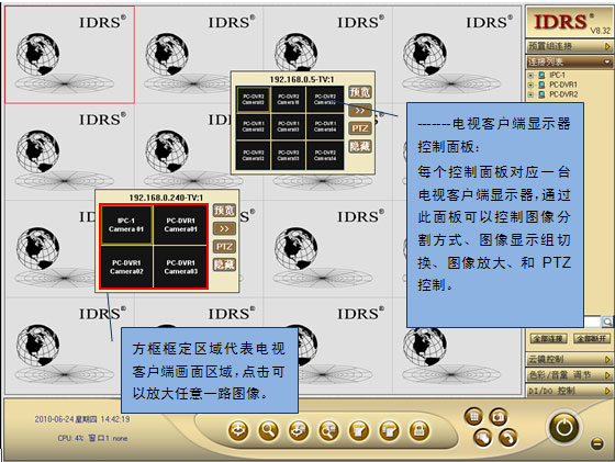 IDRS-PC Server、NVR客戶端或IDRS-NVMS集中監(jiān)控管理系統(tǒng)中的中心管理服務器、流媒體服務器和集中管理客戶端都可以作為主控設備來控制電視客戶端,一臺主控設備可以同時控制多臺電視客戶端,但所有電視客戶端的顯示器總數(shù)不能超過24臺(即一臺主控設備最多能控制由24臺顯示器組建的顯示器墻)。